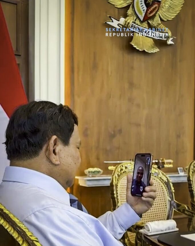 Dalam video yang diunggah akun resmi Sekretariat Kabinet, Presiden Prabowo tampak menyapa Pelatih Timnas Indonesia, Patrick Kluivert, beserta para pemain yang berkumpul di ruang tim.melalui panggilan video, Rabu (8/10/2025).