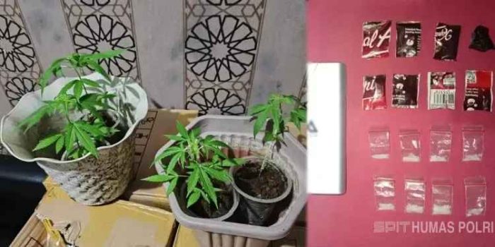 Dari lokasi itu, polisi menyita barang bukti berupa satu paket sabu, satu unit timbangan digital, serta empat pot gelas plastik yang ditanami tanaman ganja.
